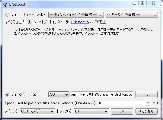 Debian Live USB を作成するには UNetbootin を使います。UNetbootin では USB メモリに書き込む ISO イメージファイルをダウンロードしながらネットインストールできますが、今回はあらかじめダウンロードした ISO イメージファイルを指定して書き込みます。