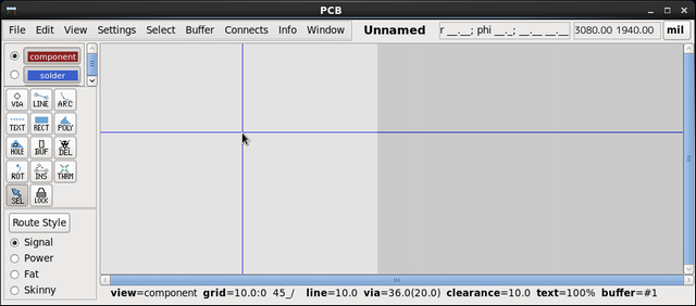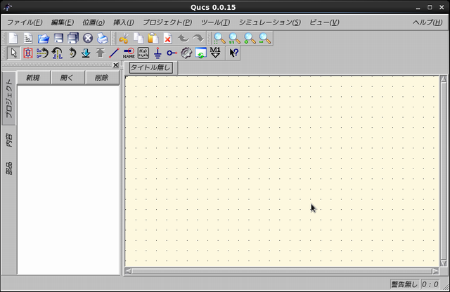 electronics-menuをインストールすると「アプリケーション」メニューに電子工学という項目が新たに追加され、PCB Designerが先にインストールしたQucs、Circuit and PCB design(gEDA Schematic Editor、gEDA Attribute Editor)とともに追加されています。以下、起動した初期画面です。