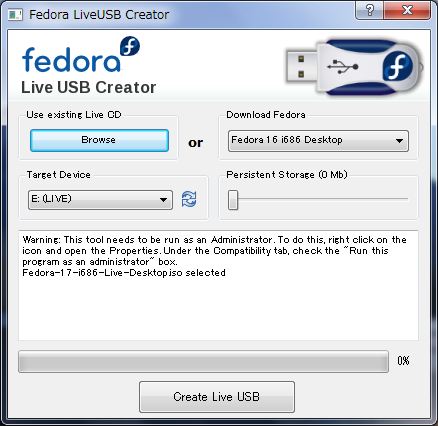 Fedora 17 Live USBを作成するには Unetbootin や LinuxLive USB Creator を使う方法もありますが、ここでは liveusb-creator を使って作成する方法を紹介します。なお、LinuxLive USB Creator の使用方法は「Linux Mint 12をUSBドライブから起動」で紹介しています。