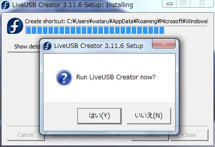 インストールが終了すると「LiveUSB Creator を今すぐ実行するか」ときかれるのでとりあえず「いいえ」をクリックしてインストールを終了させました。