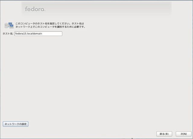 「ホスト名.ドメイン名」のようにFQDNの形式で、ホスト名を指定して「次(N)」をクリックします。手動でネットワークの設定を行う場合は「ネットワークの設定」ボタンをクリックしてネットワークの設定を行いますが、DNSサーバーが動作している場合はその必要はありません。