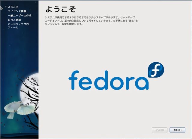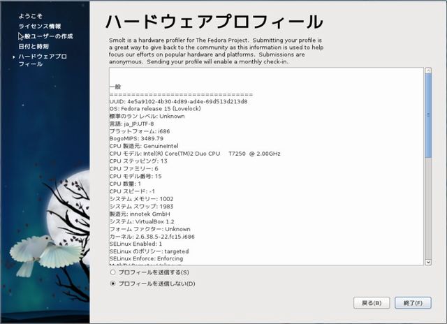 ハードウェアの構成が表示されます。この情報をFerora Project のコミュニティに送信するかしないかを選択します。ここでは「プロフィールを送信しない(D)」にチェックします。「終了(F)」をクリックしてインストールは完了です。