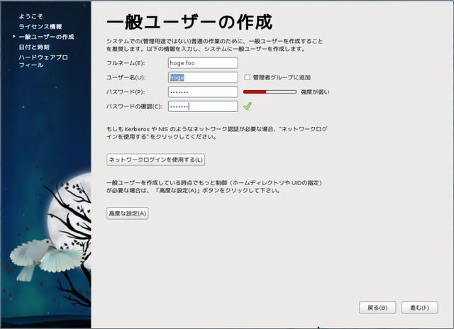 システムにログインするユーザーアカウントを作成します。名前、ユーザー名、パスワードを入力します。パスワードが正しいことを保証するために同じパスワードを2度入力します。入力後「進む(F)」をクリックします。