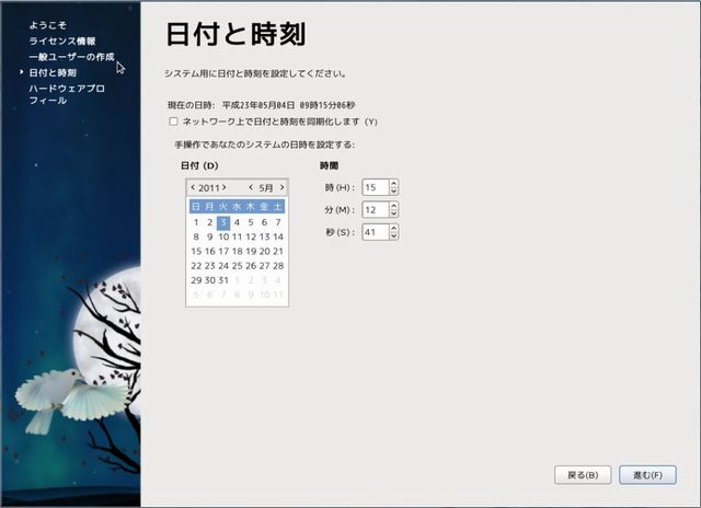 システムがインターネットに接続できない、またはNTPサーバを持たない場合は、この画面で手動で日付と時刻を設定します。それ以外の場合は、時計の正確さを維持するために NTP サーバを使うことができます。NTP は同一のネットワーク上にあるコンピューターの時刻を同期するサービスを提供します。インターネット上には公開されたNTPサービスを提供しているコンピューターが多くあります。