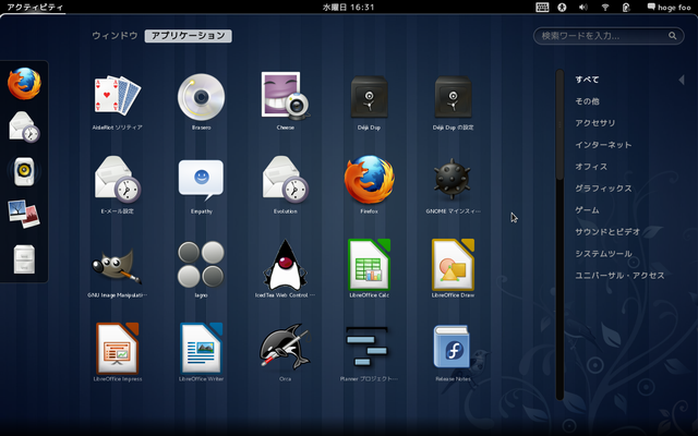 起動後のデスクトップ画面で「アクティビティ」-「アプリケーション」をクリックするとアプリケーションのアイコンが表示されます。これまでのGNOME とはことなったUIとなっています。