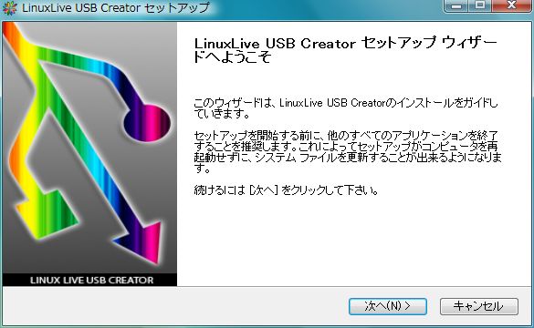 LinuxLive USB Creatorセットアップウィザードが開きますので、「次へ(N)」をクリックします。