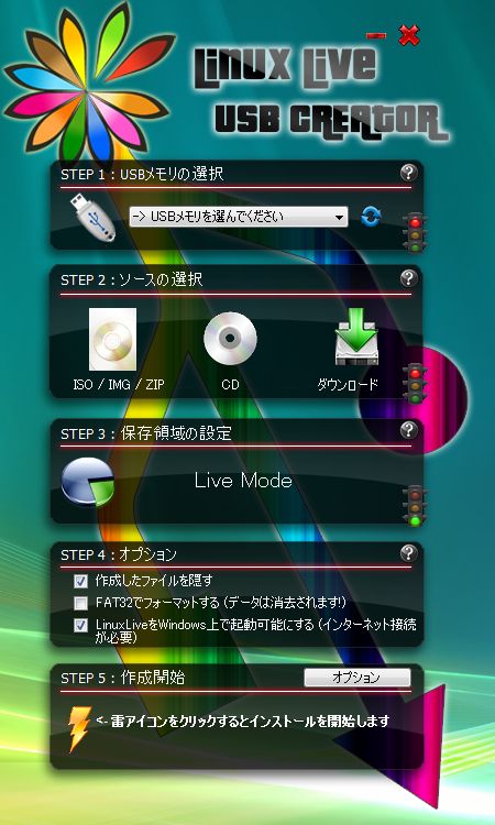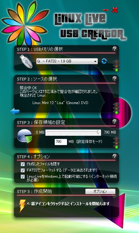 特徴的なUIですが、STEP 1 からSTEP 5 までを順番に実行します。STEP 1で2GBのUSBメモリを選択、STEP 2でダウンロードしたLinux Mint 12のイメージファイルを選択、STEP 3で保存領域に使用する領域のサイズを設定します。STEP 4では「FAT32をフォーマットする」を選択してSTEP 5で雷アイコンをクリックするとインストールが開始します。