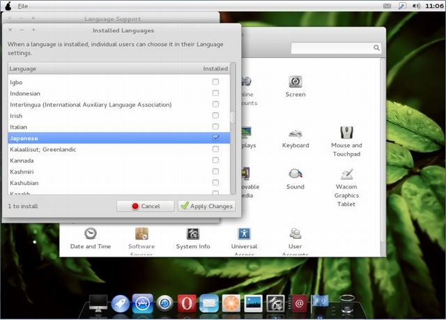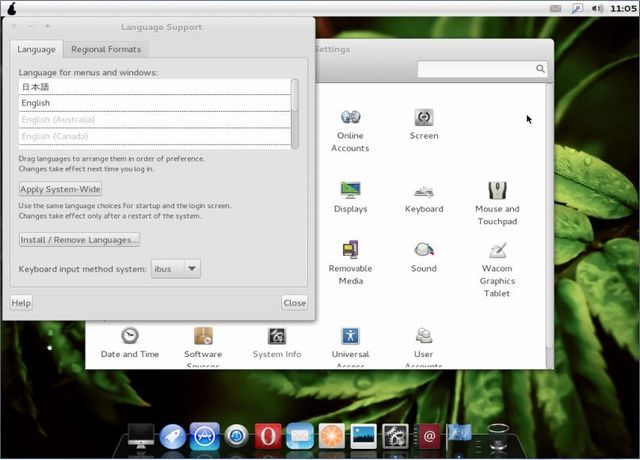 デスクトップ下のDockの「Pear OS Control Center」アイコンをクリックします。開いたウィンドウ内の「Language Support」アイコンをクリックし、「Language for menus and windows」リストボックス内の「日本語」をドラッグアンドドロップリストの一番上に移動します。そして、「Install/Remove Languages...」ボタンをクリックします。