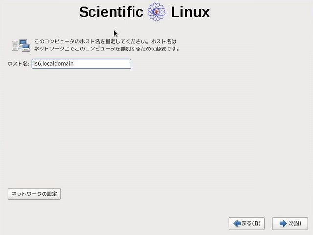 「ホスト名.ドメイン名」のようにFQDNの形式で、ホスト名を指定して「次(N)」をクリックします。手動でネットワークの設定を行う場合は「ネットワークの設定」ボタンをクリックしてネットワークの設定を行いますが、DNSサーバーが動作している場合はその必要はありません。