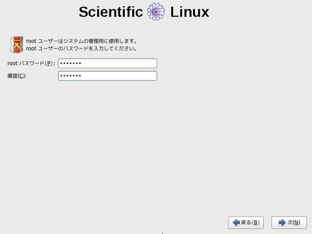 ルートユーザー(root)のパスワードを設定します。確認のために同じパスワードを2度入力して「次(N)」をクリックする。