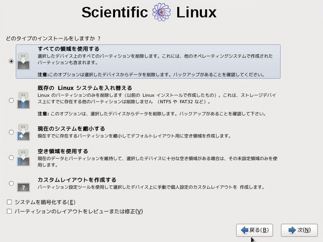 「空き領域を使用する」オプションは、現在HDD上にあるパーティションおよびデータをすべて維持したまま、空き領域にScientific Linuxをインストールするときに選択します。HDDに十分な空き領域がある場合に選択するとよいでしょう。