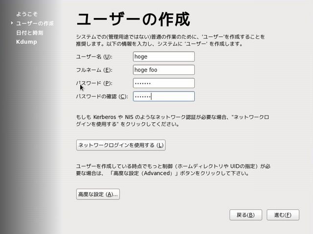 システムにログインするユーザーアカウントを作成します。名前、ユーザー名、パスワードを入力します。パスワードが正しいことを保証するために同じパスワードを2度入力します。入力後「進む(F)」をクリックします。