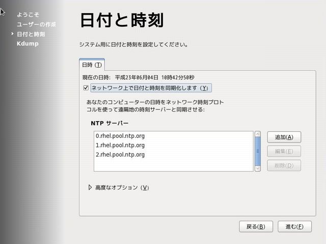 システムがインターネットに接続できない、またはNTPサーバを持たない場合は、この画面で手動で日付と時刻を設定します。それ以外の場合は、時計の正確さを維持するために NTP サーバを使うことができます。NTP は同一のネットワーク上にあるコンピューターの時刻を同期するサービスを提供します。インターネット上には公開されたNTPサービスを提供しているコンピューターが多くあります。