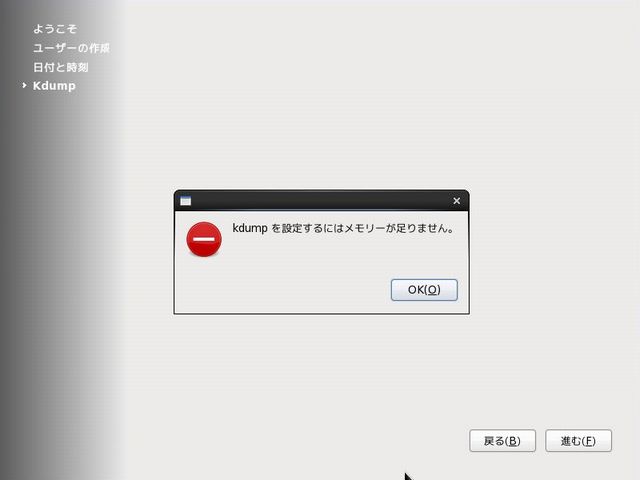kdumpの設定をします。メモリが足りないとのことでkdumpの設定をすることができませんでした。実装しているメモリは1024MBなのですが足りないようです。