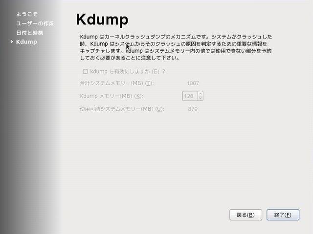 Kdumpの設定はしないまま「終了(F)」をクリックしてインストールを終了します。