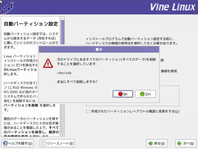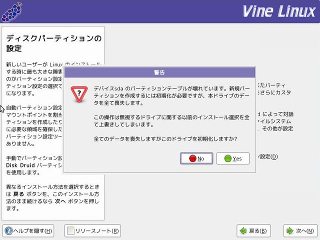 新規のハードディスクへのインストールの場合、デバイスsda のパーティションテーブルが壊れている為、初期化が必要との警告がでますが、気にせず「Yes」ボタンをクリックします。