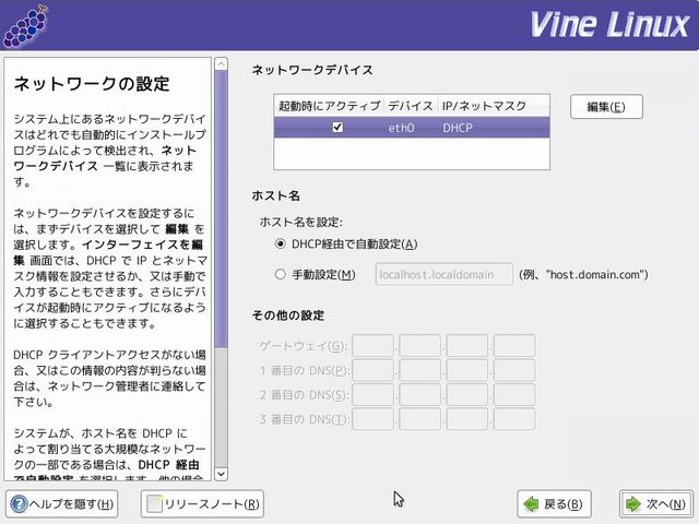 ここでは、IPとネットマスクはDHCP 経由で設定し、ホスト名は手動で設定します。