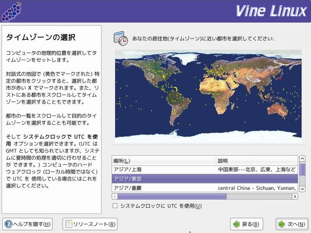 タイムゾーンを選択します。デフォルトではアジア/東京になっていますので、通常はこのままでよいでしょう。PCの内蔵時計をUTCを使用している場合は、「システムクロックにUTCを使用」を選択します。