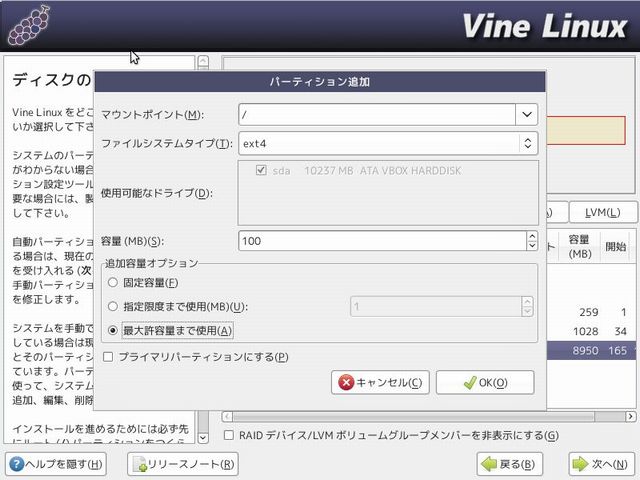 「マウントポイント(M):」は/を選択し、追加オプションで「最大許容量まで使用(A)」にチェックをいれて「OK(O)」をクリックします。