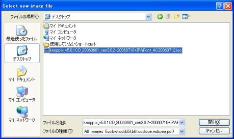 ここで、ファイルの種類を「All files (*.*)」と指定します。デフォルトでは「All images (iso,bwt,cdi,b5t,b6t,ccd,cue,mds,nrg,pdi)」となっていて、このままisoイメージファイルを選択してしまうと当然必要なファイルが選択されず、KNOPPIXが起動しませんので注意が必要です。ファイルの種類を「All files (*.*)」と指定し、isoイメージファイルを選択するとE:ドライブとしてマウントされます。