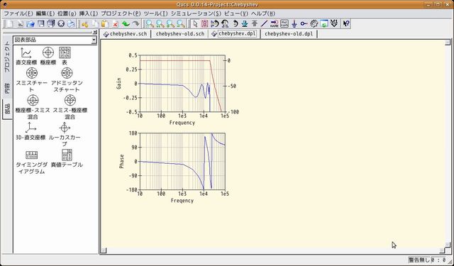 メニューバーの「シミュレーション(S)」メニューから「シミュレート」をクリックするか、シミュレーションアイコンをクリックしシミュレーションを実行します。シミュレーションが成功すると自動的に画面右側にシミュレーション結果のタブが作られ、また左側のタブが「図表部品」に切り替わります。そして、「図表部品」から直交座標を選択して結果を表示させます。