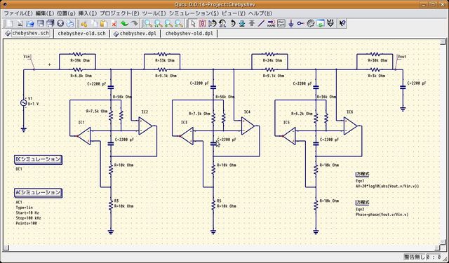 Qucs でシミュレーションをしてみましょう。アナログ回路シミュレーションはアクティブ・ローパス・フィルタで、デジタル回路シミュレーションは3ビットの同期カウンタを例にします。
