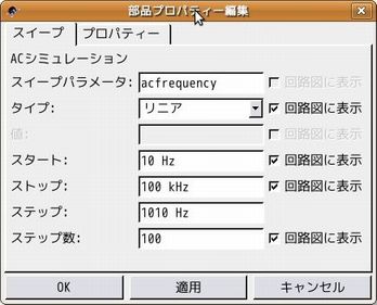 次に「ACシミュレーション」部品を置きます。「ACシミュレーション」部品をダブルクリックし、シミュレーション条件を設定します。