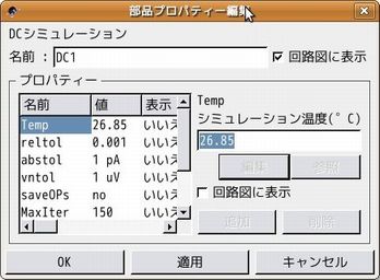 シミュレーションをするには、「部品」-「シミュレーション部品」から必要なシミュレーション部品をドラッグして回路図上に置きます。部品をダブルクリックすると部品プロパティー編集ウィンドウが開くので、シミュレーション条件等を設定します。