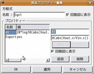 「挿入(I)」メニューから「方程式を挿入」を選択して回路図上に置きます。方程式をダブルクリックし、名前をAVとし、値に20*log10(abs(Vout.v/Vin.v))を入力します。