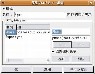 さらに「挿入(I)」メニューから「方程式を挿入」を選択し、名前にPhase、値にPhase(Vout.v/Vin.v)を入力します。