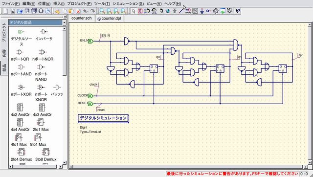 Qucsはデジタル回路のシミュレーションもできます。デジタルシミュレーションするにはフリーのVHDLシミュレータであるFreeHDLがインストールされている必要があります。