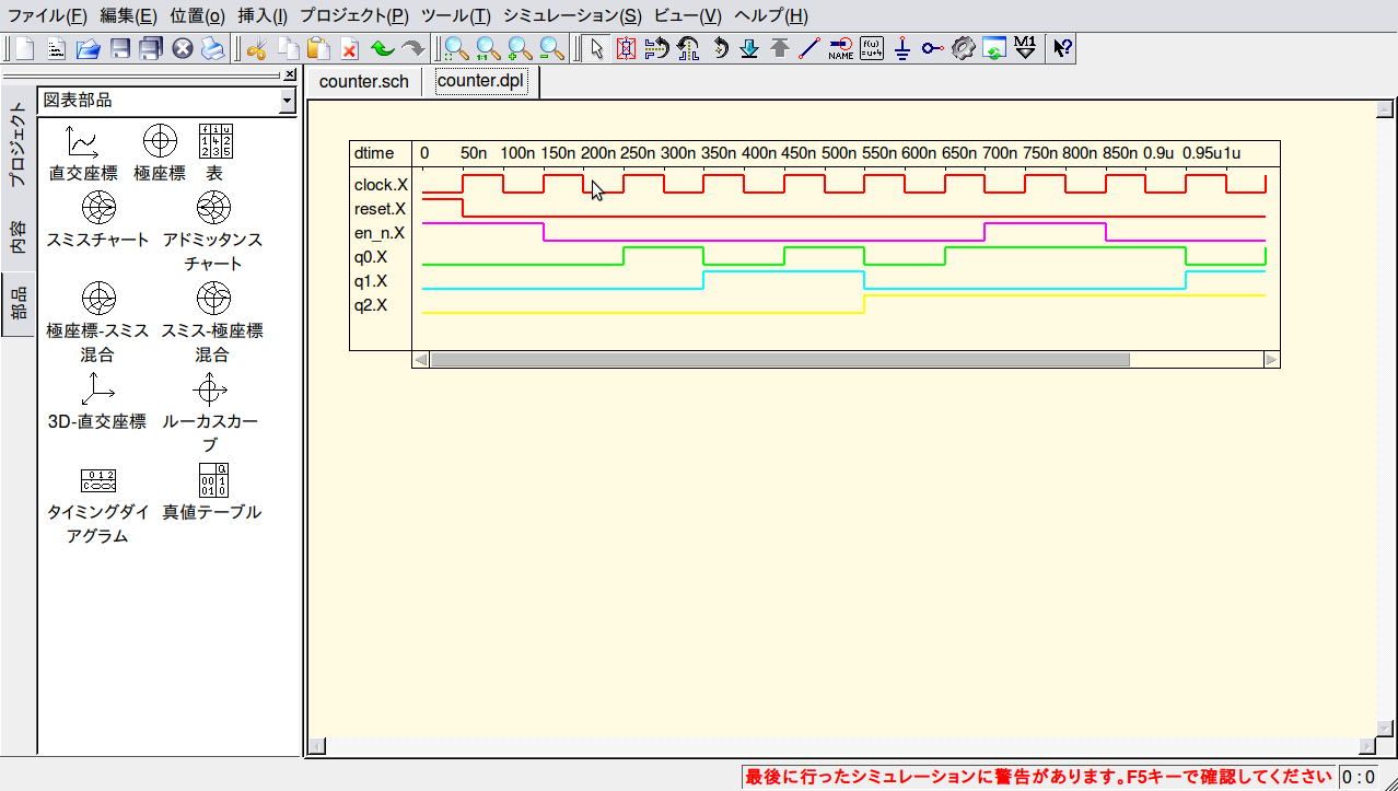 メニューバーの「シミュレーション(S)」メニューから「シミュレート」をクリックするか、シミュレーションアイコンをクリックするとネットリストの作成、コンパイルが実行されます。シミュレーションが成功すると自動的に画面右側にシミュレーション結果のタブが作られ、また左側のタブが「図表部品」に切り替わります。「図表部品」からタイミングダイアグラムをワークエリアにドラッグするとグラフプロパティ編集画面が開くので、「データセット」ボックスから表示させる信号を選択して「グラフ」ボックスに追加します。