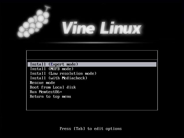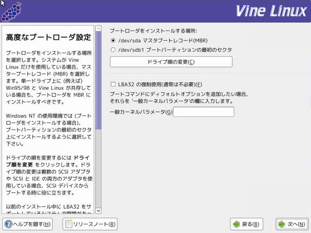 以降のインストール作業は「Vine Linux 5.2 のインストール」を参照ください。