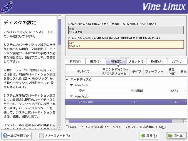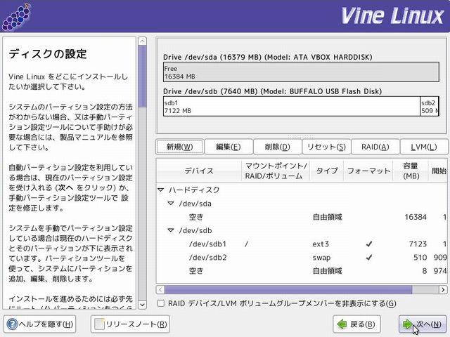 Vine Linux 5.2をハードディスクにインストールする記事はこのサイトのVine Linux 5 のインストールでも紹介していますが、ここではインストール先をUSBメモリにした時の記事です。