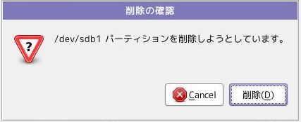 「/dev/sdb1 パーティションを削除しようとしています」との確認メッセージが表示されます。「削除(D)」をクリックします。