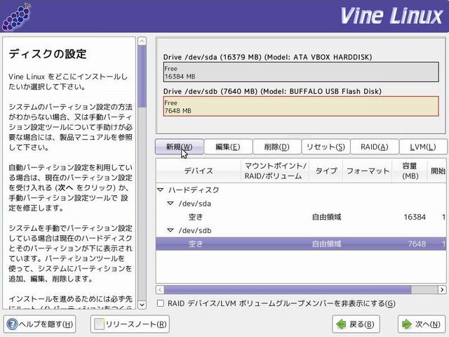 /dev/sdb が空きデバイスになっていますので、/dev/sdb を選択して「新規(N)」をクリックします。