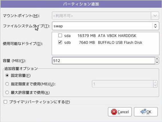 使用可能なドライブで sda のチェックを外し sdb にチェックを入れ、ファイルシステムタイプで「swap」を選択します。ここではスワップ領域の容量を512MBにしていますが、システムに合った容量を割り当てればよいでしょう。