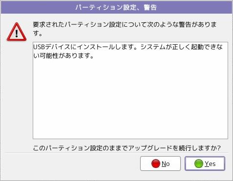 USBデバイスにインストールすると、システムが正しく起動できない可能性がある旨の警告がでますが「Yes」をクリックしてインストールを続行します。