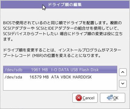 ドライブ順を変更することでマスターブートレコード(MBR)の位置を変えます。/dev/sdb を選択して右の上矢印で一番上に移動し「OK」をクリックします。