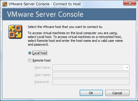 VMware Serverのインストールが終了したらデスクトップにVMware Server Consoleのアイコンができているので、これをダブルクリックする。するとVMware Server Consoleの接続先を指定するウィンドウが表示されます。