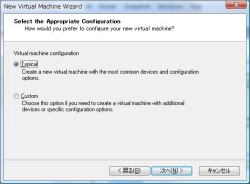 仮想マシンを作成するためのコンフィグレーションを指定します。特別なデバイスやオプションを追加する必要がなければデフォルトの「Typical」を選択しておけばよいでしょう。ここでも「Typical」にチェックを入れて「Next」をクリック。