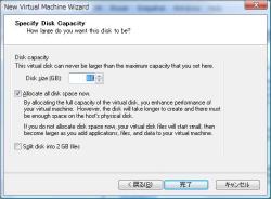 仮想マシンのディスク容量を設定します。8GBを仮想マシンのディスクとして設定し、「完了」をクリックすると、仮想ディスクの作成が開始されます。