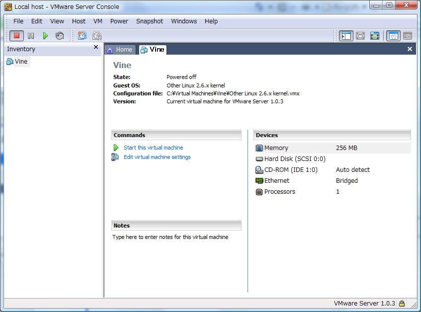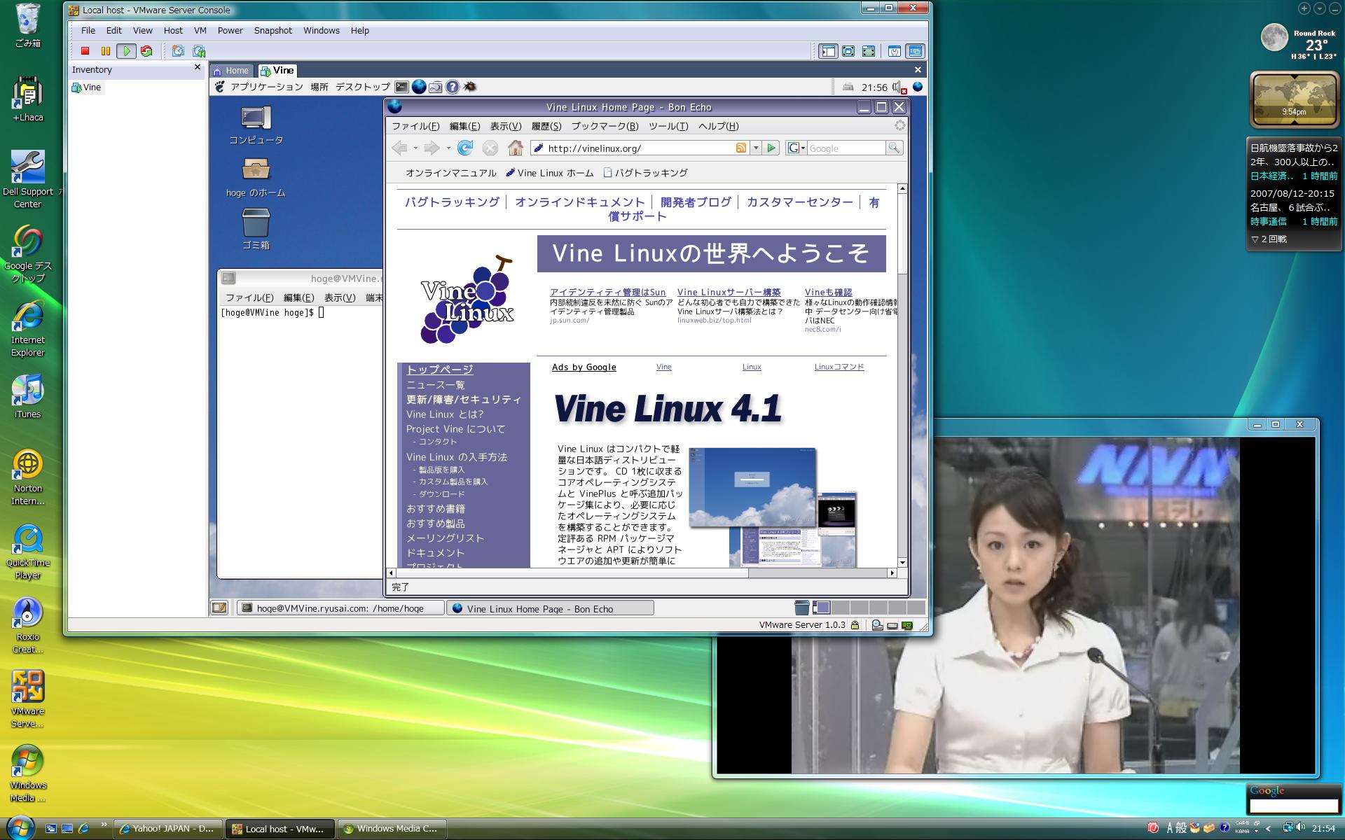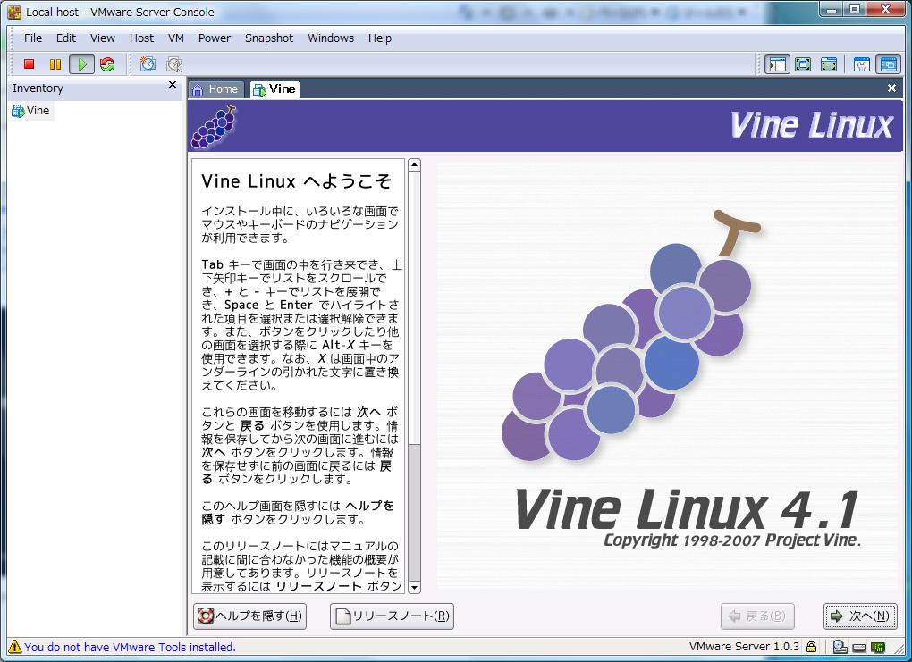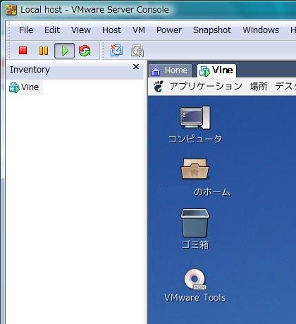以下、VistaにインストールしたVMware ServerでVine Linux 4.1を起動させた画面。