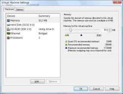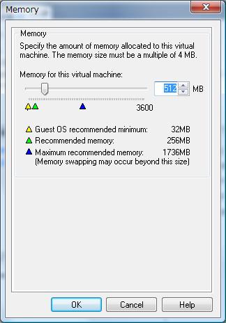 仮想マシンに割り当てるメモリ容量を設定します。デフォルトでは256MBが推奨されていましたが、512MBとしています。「Device」の項目の設定はいつでも変更可能ですので、新たに仮想マシンを追加するような時には適宜、設定しなおせばよいでしょう。