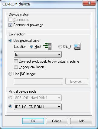 仮想マシンのCD-ROMの設定をします。「Device」の「CD-ROM」をダブルクリックして、「Connection」のプルダウンメニューでCD-ROMのドライブを指定します。