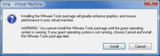 「VM」→「Install VMware Tools...」をクリックすると「ゲストOSが動いていないとインストールできない」旨のメッセージウィンドウが開きます。