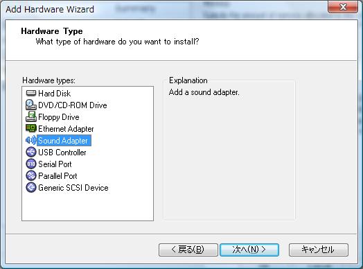 追加するハードウェアを選択する。まず、「Sounud Adapter」を選択して「次へ」をクリック。