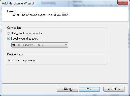 「Connection」で「Spechify sound adapter:」にCreativeのSB X-Fiが選択されているのを確認してチェックを入れる。そして「完了」をクリック。