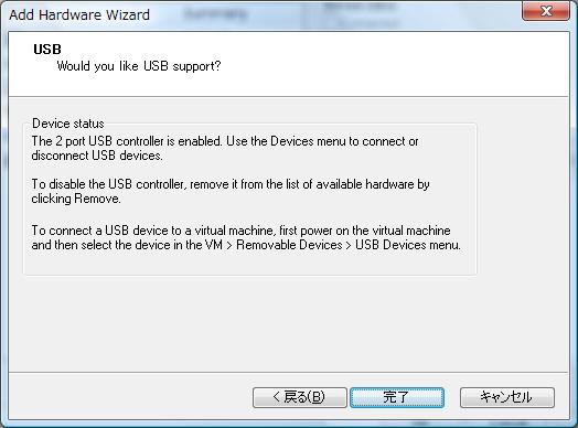 USBをサポートしたいかと聞かれるので、そのまま「完了」をクリックする。こうしないとUSBコントローラが認識されないようだ。