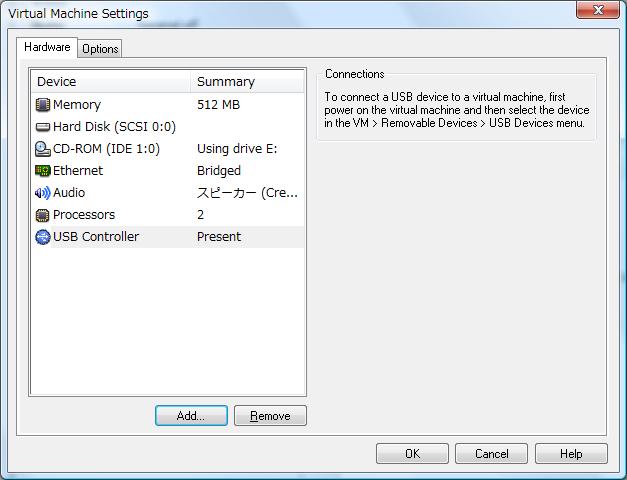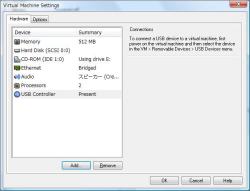 デフォルトではUSBコントローラとオーディオデバイスが認識されていない。VMware Server Consoleの「Edit virtual machine settings」をクリックしてVirtual Machine Settingウィンドウを起動させ、ハードウェアを認識させる必要がある。